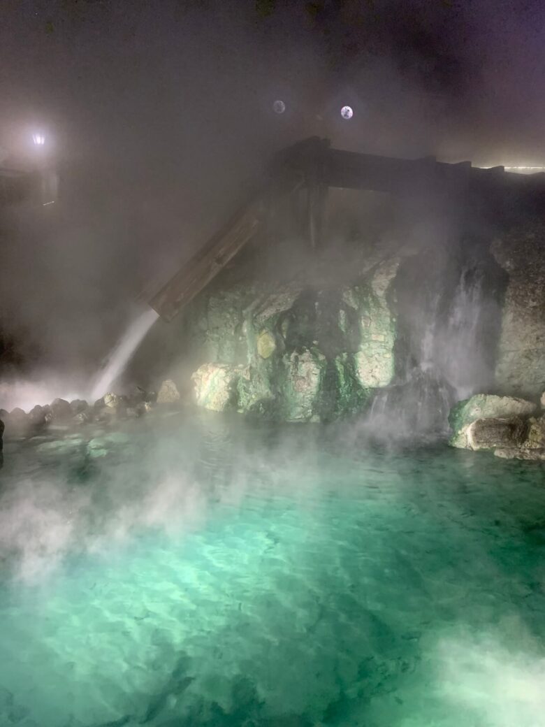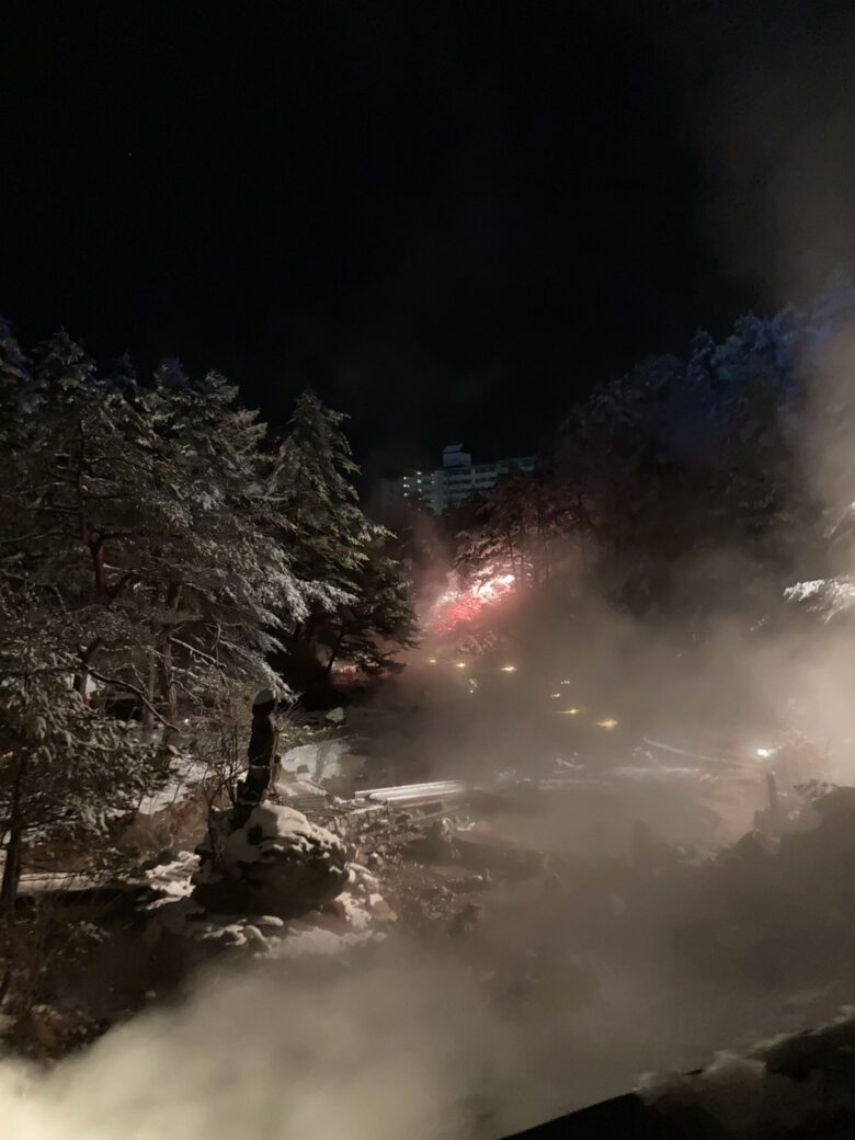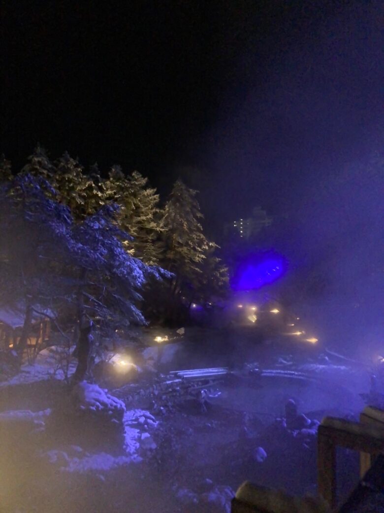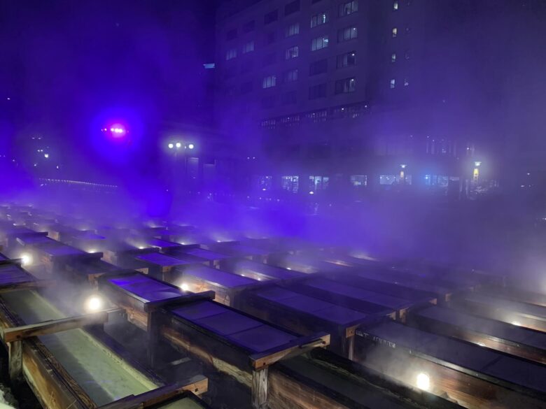なぜなら、冬ならではの降り積もった雪や、もうもうと立ち昇る湯気にライトが反射して、昼間とは違う幻想的な光景が見られるからなんです!