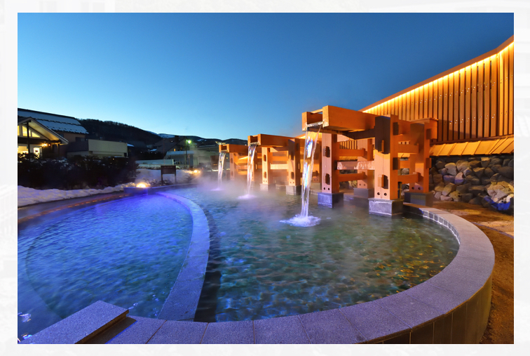 夜、ライトアップされた中で楽しむ足湯も気持ちいいですよ~。