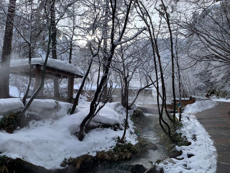 温泉の川が流れるというだけでも珍しいですが、さらに冬季は川から立ち昇る湯けむりの特別感も外せない要素です。