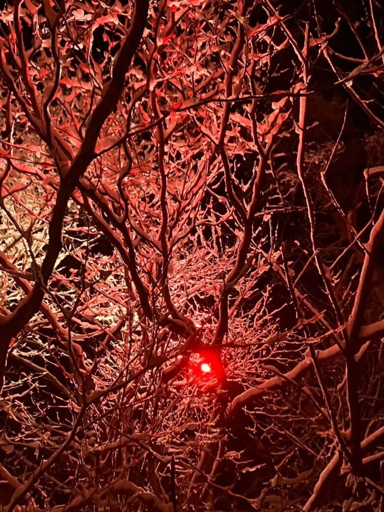木々の枝に降り積もった雪がライトに照らされ、色が変わるたびに印象も大きく変わります。